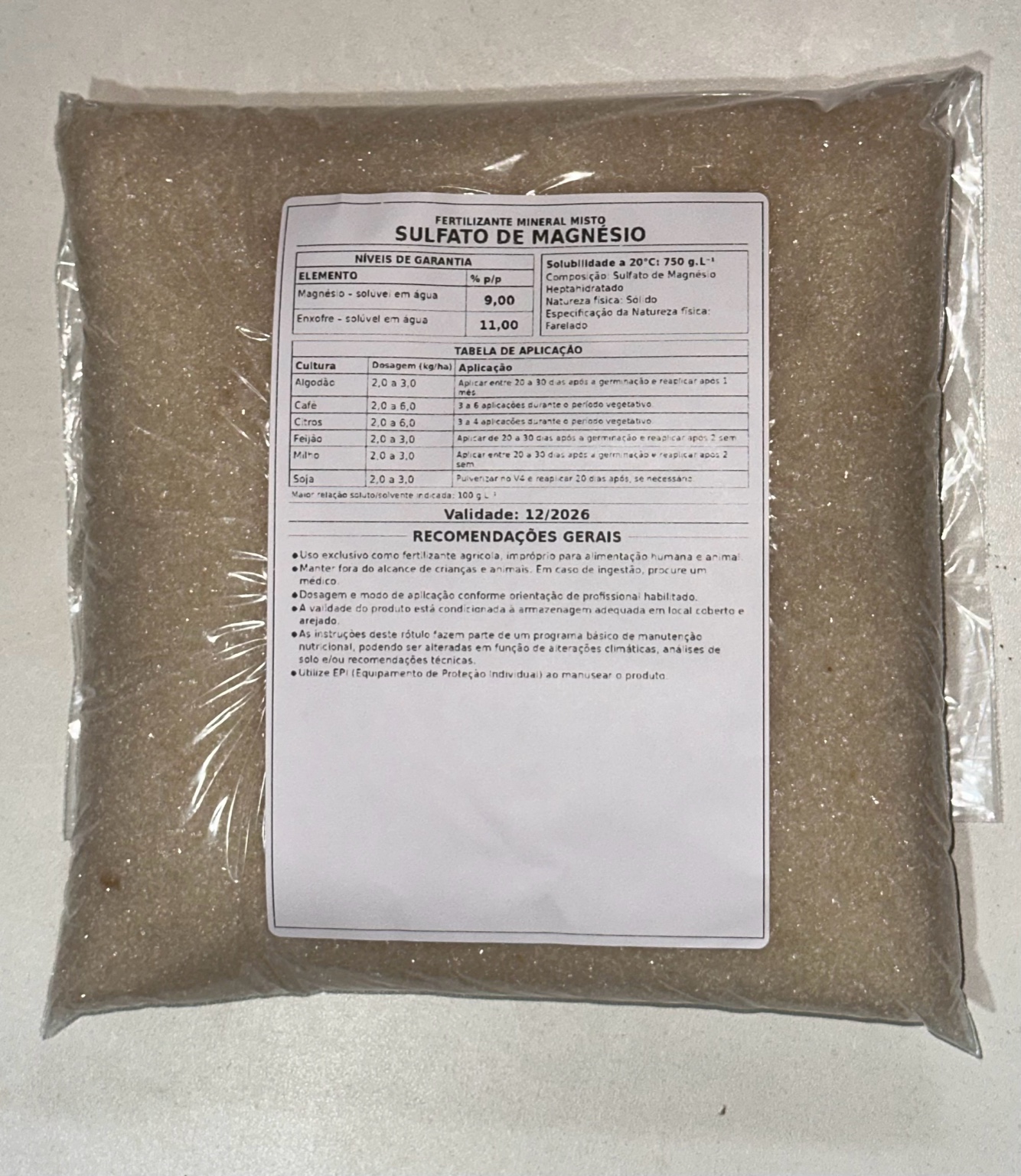 O produto vem acondicionado em embalagem plástica contendo 1kg de sulfato de magnésio granuloso.